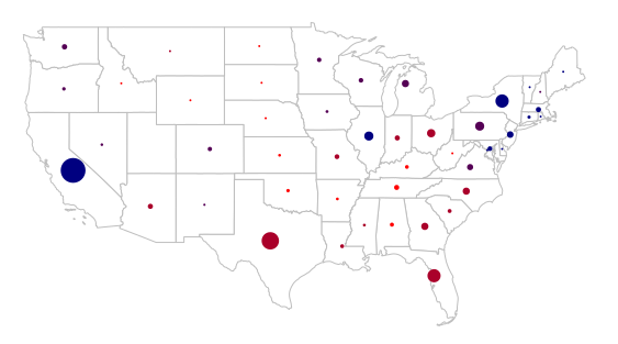 For this example, we map the percentages of democratic votes in the 2012 US presidential election (bubble color) and the populations of the states (bubble size):