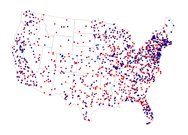 One drawback of this technique is that if locations associated with those dots are not also randomly-dispersed, the map is deceptive. The following script creates a dot-density map of Democratic (blue) and Republican (red) votes, with each dot representing 100,000 people. While this map illustrates the sparse population of some states better than a choropleth, it does not clearly show concentrations of populations in large urban areas.