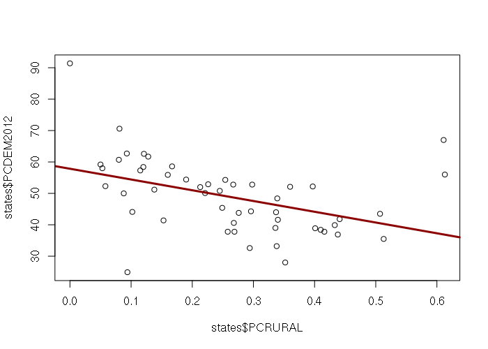 > m = lm(PCDEM2012 ~ PCRURAL, data=states)