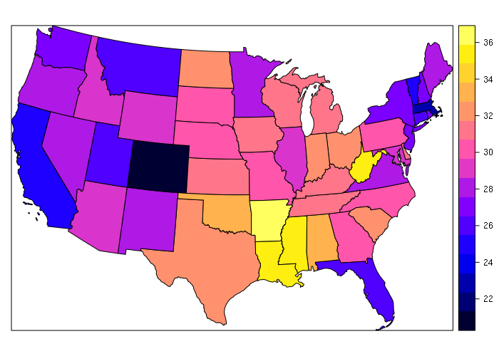 > states = merge(states, data.frame(st, obesity), by.x = 'ST', by.y = 'st')