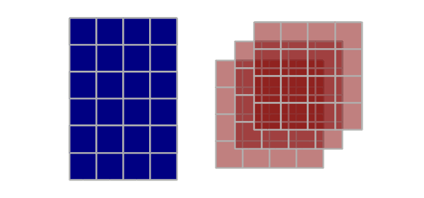 Full-color raster images need three overlapping raster layers representing red, green, and blue light frequencies, respectively.