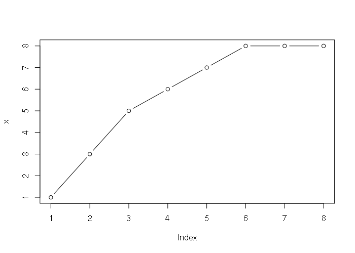 > x = c(1, 3, 5, 6, 7, 8, 8, 8) > plot(x, type='b')