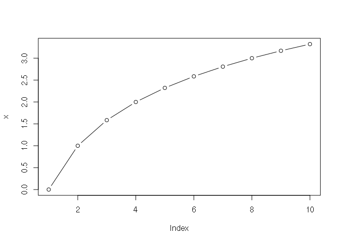 > x = log(1:10, 2) > x [1] 0.000000 1.000000 1.584963 2.000000 2.321928 2.584963 2.807355 3.000000 [9] 3.169925 3.321928 > plot(x, type="b")
