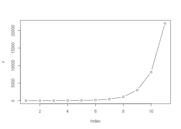 > x = exp(0:10) > x [1] 1.000000 2.718282 7.389056 20.085537 54.598150 [6] 148.413159 403.428793 1096.633158 2980.957987 8103.083928 [11] 22026.465795 > plot(x, type="b")