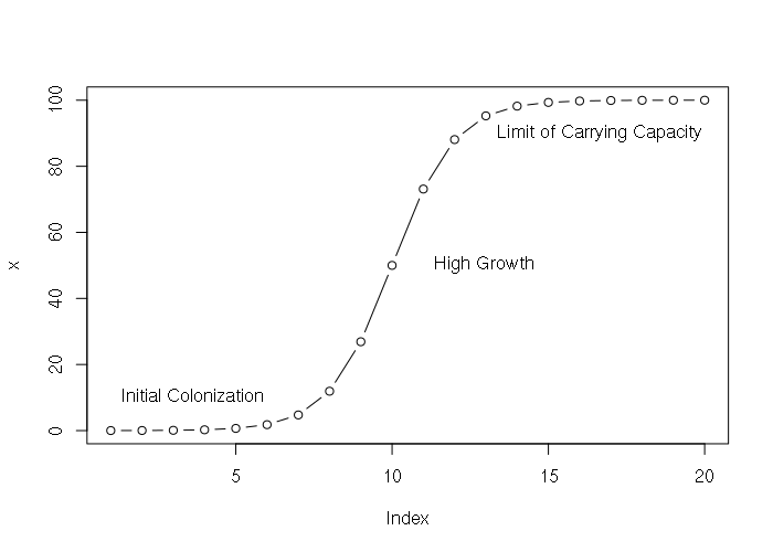 > x = SSlogis(1:20, Asym = 100, xmid = 10, scal = 1) > x [1] 0.01233946 0.03353501 0.09110512 0.24726232 0.66928509 1.79862100 [7] 4.74258732 11.92029220 26.89414214 50.00000000 73.10585786 88.07970780 [13] 95.25741268 98.20137900 99.33071491 99.75273768 99.90889488 99.96646499 [19] 99.98766054 99.99546021 > plot(x, type="b") > text(1, 10, "Initial Colonization", pos=4) > text(11, 50, "High Growth", pos=4) > text(13, 90, "Limit of Carrying Capacity", pos=4)