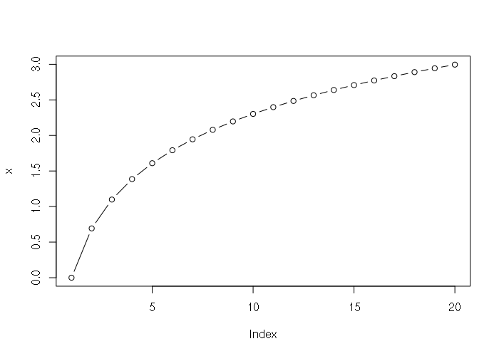 > x = log(1:20) > x [1] 0.0000000 0.6931472 1.0986123 1.3862944 1.6094379 1.7917595 1.9459101 [8] 2.0794415 2.1972246 2.3025851 2.3978953 2.4849066 2.5649494 2.6390573 [15] 2.7080502 2.7725887 2.8332133 2.8903718 2.9444390 2.9957323 > plot(x, type="b")