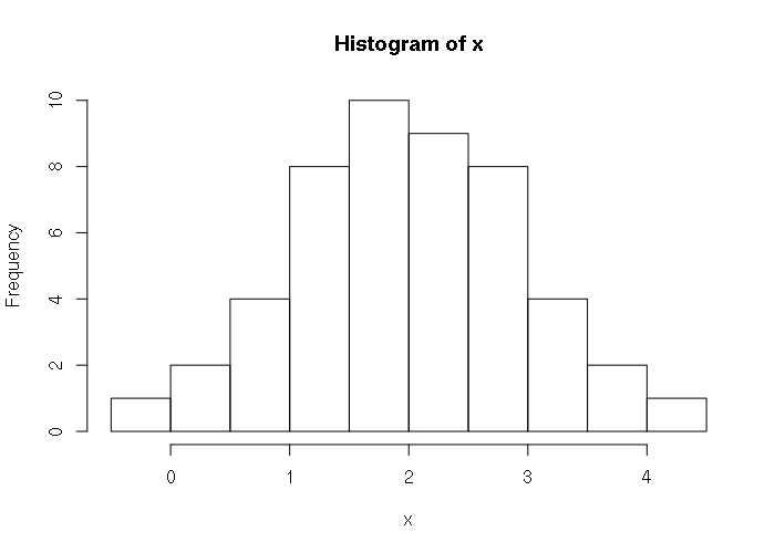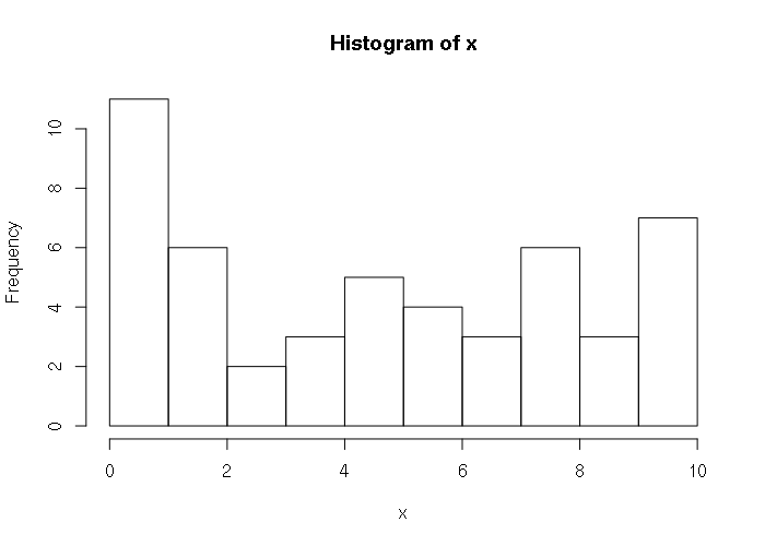 > x = as.integer(round(runif(50, 0, 10))) > x [1] 2 7 6 2 0 7 1 5 7 4 8 1 9 10 1 1 0 10 8 9 2 6 8 5 10 [26] 10 3 10 8 5 6 4 4 10 10 5 2 2 1 1 5 6 1 2 1 8 9 1 8 3 > hist(x, breaks=11)