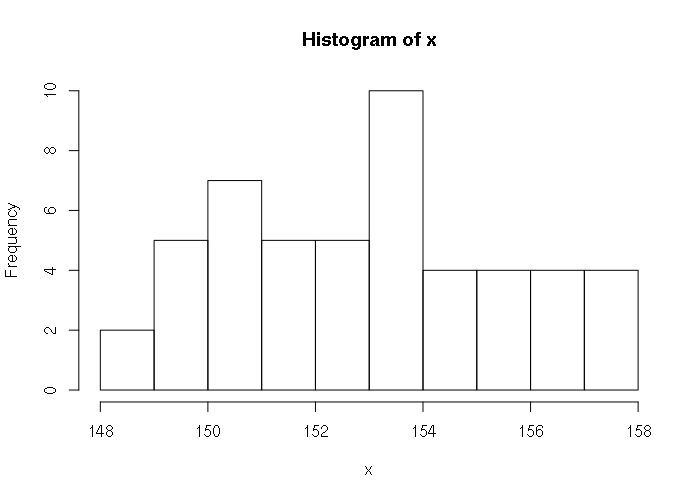 > x = rnorm(50, (5 * 12) + 93, 2.94) > x [1] 153.4227 152.6538 150.3185 148.7735 150.6566 156.6870 155.2701 152.3546 [9] 151.7511 151.7682 155.9311 152.1892 156.6927 154.9012 156.8200 150.4326 [17] 153.0246 150.4102 154.7530 153.3520 152.1704 157.2806 153.6733 155.9298 [25] 155.2987 150.7163 151.1890 153.1369 149.6767 154.6956 149.2346 157.7788 [33] 151.5280 157.9342 151.7872 150.1415 153.0746 153.0808 148.0603 156.0980 [41] 149.7084 153.9867 154.4547 153.4059 152.6508 153.5812 149.8580 150.6386 [49] 149.7255 157.6455 > hist(x, breaks=10)