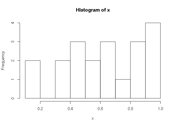 > x = runif(20) > x [1] 0.6877721 0.7481171 0.9397808 0.6928701 0.6112946 0.4786213 0.3839646 [8] 0.4164434 0.9205573 0.8799462 0.1750195 0.5641760 0.9437534 0.5265315 [15] 0.1380678 0.8415553 0.4562519 0.8806186 0.9218461 0.3643150 > hist(x)