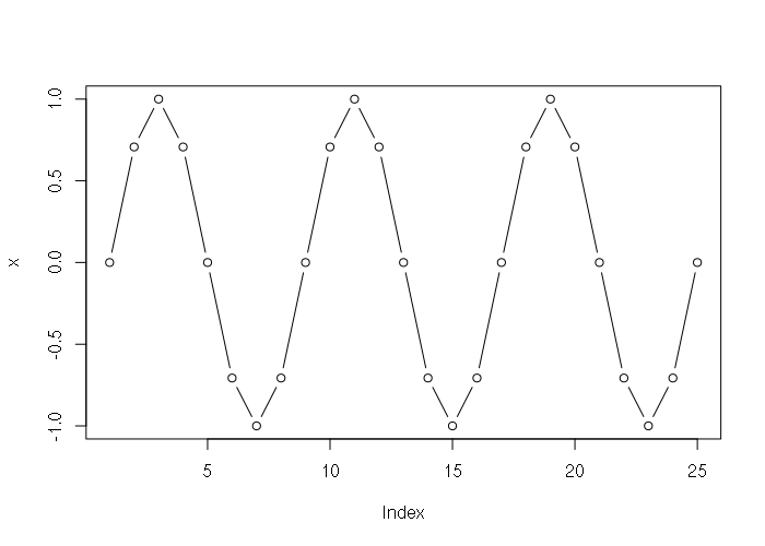> x = sin(seq(0, 6, 0.25) * pi) > x [1] 0.000000e+00 7.071068e-01 1.000000e+00 7.071068e-01 1.224647e-16 [6] -7.071068e-01 -1.000000e+00 -7.071068e-01 -2.449294e-16 7.071068e-01 [11] 1.000000e+00 7.071068e-01 3.673940e-16 -7.071068e-01 -1.000000e+00 [16] -7.071068e-01 -4.898587e-16 7.071068e-01 1.000000e+00 7.071068e-01 [21] 6.123234e-16 -7.071068e-01 -1.000000e+00 -7.071068e-01 -7.347881e-16 > plot(x, type="b")