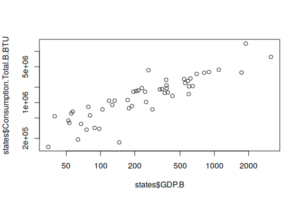 plot(states$GDP.B, states$Consumption.Total.B.BTU, log="xy")