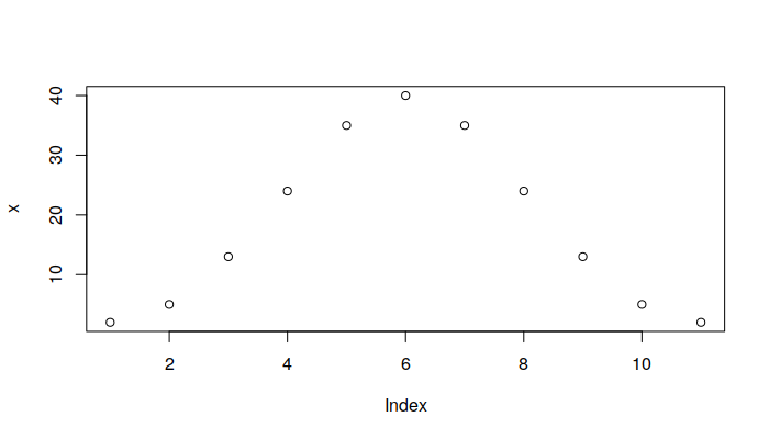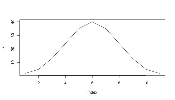 x = c(2, 5, 13, 24, 35, 40, 35, 24, 13, 5,2) plot(x)