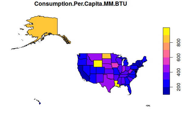 This creates a map of per-capita energy use in each state in millions of BTUs. The default plot uses a blue-purple-yellow color ramp: