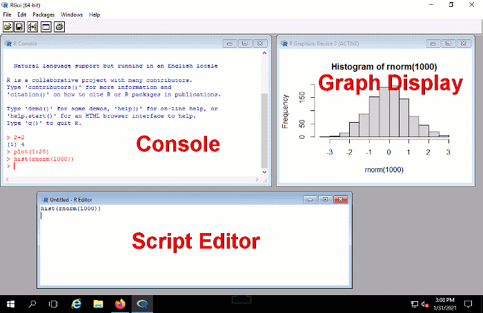 Although R on Windows has its own user interface (above), you will likely find R easier to use through the interactive development environment RStudio Desktop.