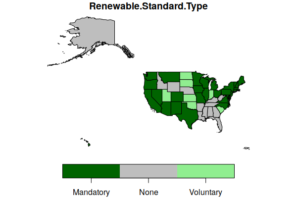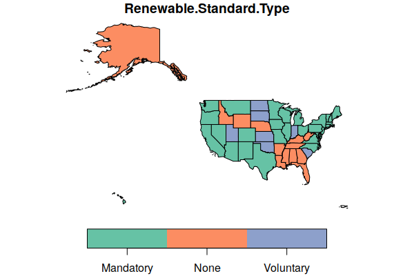 - We use the field Renewable.Standard.Type, which is the type of renewable energy standard in effect in each state.