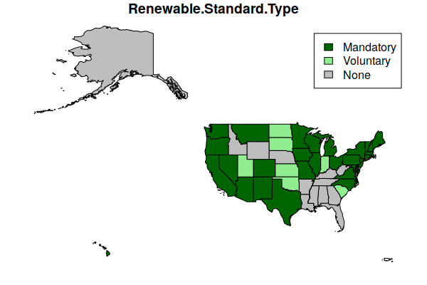 plot(states["Renewable.Standard.Type"], key.pos=NULL, pal=c("gray", "darkgreen", "lightgreen"))