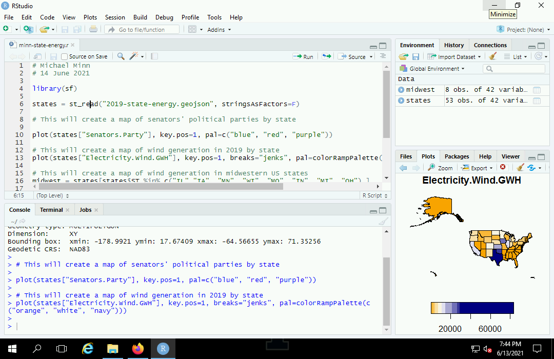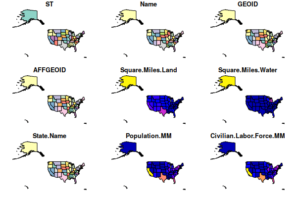 [1] "ST" "Name" [3] "GEOID" "AFFGEOID" [5] "Square.Miles.Land" "Square.Miles.Water" [7] "State.Name" "Population.MM" [9] "Civilian.Labor.Force.MM" "GDP.B" [11] "GDP.Per.Capita" "GDP.Manufacturing.MM" [13] "Personal.Income.Per.Capita" "VMT.MM" [15] "Farm.Land.MM.Acres" "Average.Temperature" [17] "Precipitation.Annual" "Consumption.Coal.B.BTU" [19] "Consumption.Jet.Fuel.B.BTU" "Consumption.Gasoline.B.BTU" [21] "Consumption.Total.B.BTU" "Consumption.Per.Capita.MM.BTU" [23] "Production.Coal.B.BTU" "Production.Gas.B.BTU" [25] "Production.Oil.B.BTU" "Production.Renewable.B.BTU" [27] "Production.Total.B.BTU" "Electricity.Interstate.Flow.GWH" [29] "Electricity.Average.Cost" "Electricity.Consumption.GWH" [31] "Electricity.Per.Capita.KWH" "Electricity.Hydro.GWH" [33] "Electricity.Nuclear.GWH" "Electricity.Solar" [35] "Electricity.Wind.GWH" "CO2.Total.MM.Tonnes" [37] "CO2.Per.Capita.Tonnes" "Renewable.Standard.Type" [39] "Renewable.Standard.Name" "Renewable.Standard.Year" [41] "Senators.Party" "geometry"