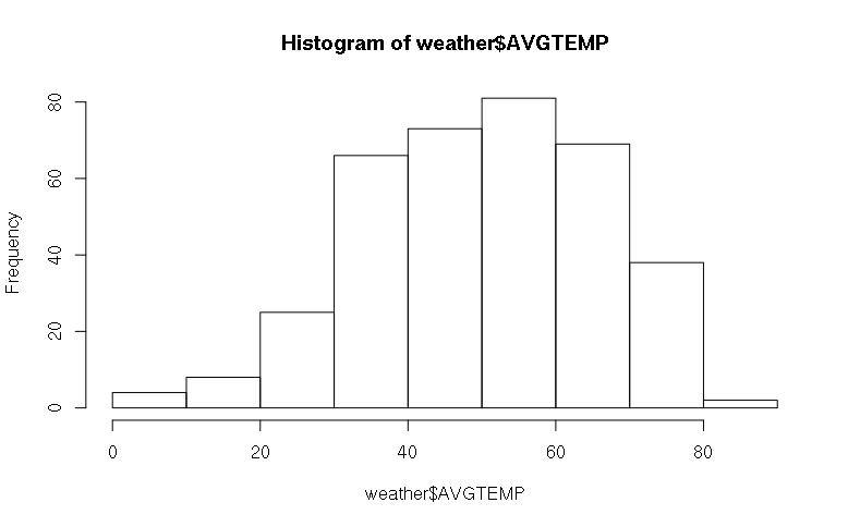 > max(weather$MAXTEMP) [1] 97 > min(weather$MINTEMP) [1] -7 > mean(weather$AVGTEMP) [1] 50.45082 > sd(weather$AVGTEMP) [1] 15.81478 > length(weather$AVGTEMP) [1] 366