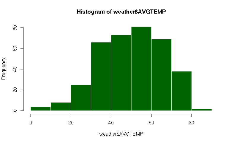 > hist(x = weather$AVGTEMP, col="darkgreen", border="white")