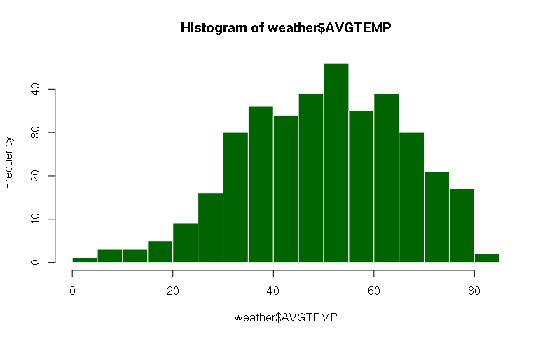 > hist(x = weather$AVGTEMP, breaks=20, col="darkgreen", border="white")