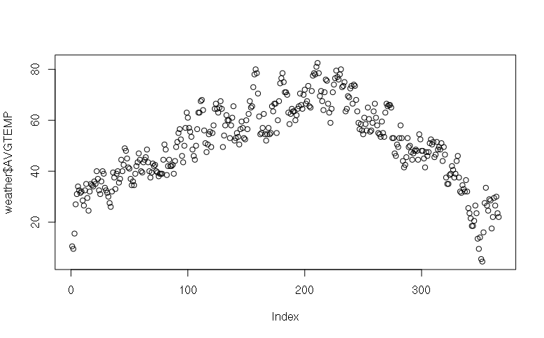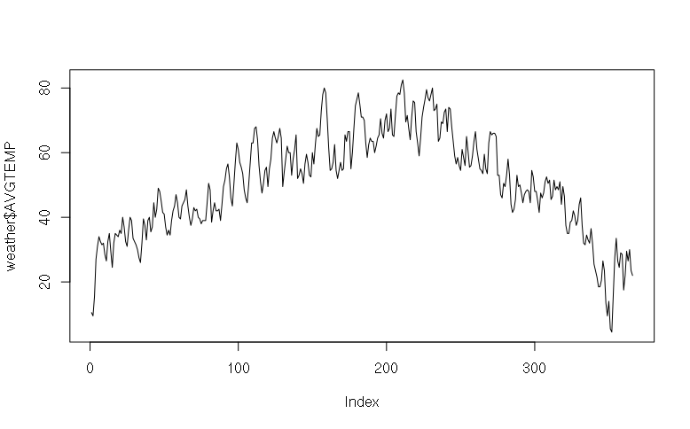 > weather$Mean.TemperatureF [1] 10.5 9.5 15.5 27.0 31.0 34.0 32.5 31.5 32.0 28.5 26.5 32.5 35.0 29.5 24.5 [16] 32.0 35.0 34.5 34.0 36.0 35.0 40.0 37.0 32.5 31.0 36.0 40.0 39.0 33.5 32.5 [31] 31.5 30.0 27.5 26.0 32.0 39.5 37.5 33.0 39.0 40.0 35.5 37.0 44.5 40.0 42.5 [46] 49.0 48.0 45.0 41.5 41.0 37.0 34.5 36.0 34.5 39.0 42.0 43.5 47.0 44.5 40.0 [61] 39.5 43.5 44.5 45.5 48.5 43.5 40.0 37.5 39.5 43.0 42.0 42.5 40.0 39.5 38.0 [76] 39.0 39.0 39.0 44.5 50.5 48.5 38.5 42.0 44.5 42.0 42.0 42.5 39.0 44.0 49.5 [91] 51.5 55.0 56.5 52.5 46.0 43.5 50.0 57.0 63.0 61.0 57.0 55.5 53.5 48.5 46.0 [106] 44.5 50.0 56.5 63.0 63.0 67.5 68.0 64.0 56.0 51.0 47.5 50.5 54.5 55.5 49.5 [121] 55.0 58.0 64.5 66.5 64.5 63.0 65.0 67.5 64.5 49.5 54.0 58.0 62.0 60.0 60.0 ...