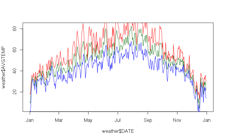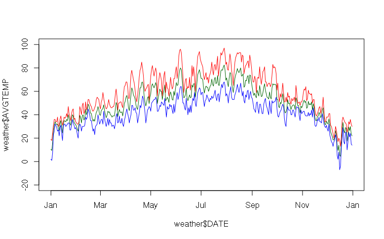 > plot(x = weather$DATE, y = weather$AVGTEMP, type="l", col="darkgreen", ylim=c(-20, 100)) > lines(x = weather$DATE, y = weather$MAXTEMP, col="red") > lines(x = weather$DATE, y = weather$MINTEMP, col="blue")