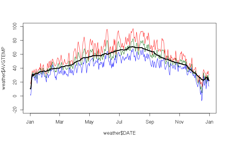 > plot(x = weather$DATE, y = weather$AVGTEMP, type="l", col="darkgreen", ylim=c(-20, 100)) > lines(x = weather$DATE, y = weather$MAXTEMP, col="red") > lines(x = weather$DATE, y = weather$MINTEMP, col="blue") > smooth = runmed(weather$AVGTEMP, 61) > lines(x = weather$DATE, y = smooth, col="black", lwd=3)