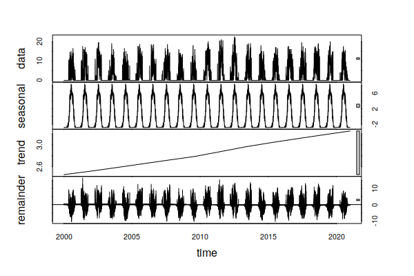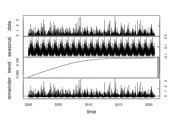 decomposition = stl(ts_ts(historical$PRCP), s.window=365, t.window=7001) plot(decomposition) summary(decomposition$time.series[,"trend"])
