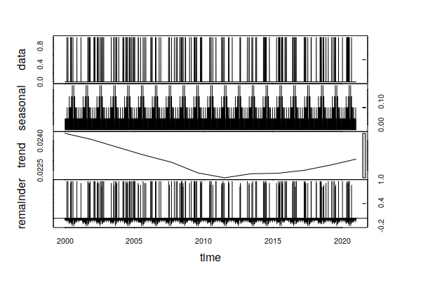 decomposition = stl(ts_ts(historical$FLOOD), s.window=365, t.window=7001) plot(decomposition)