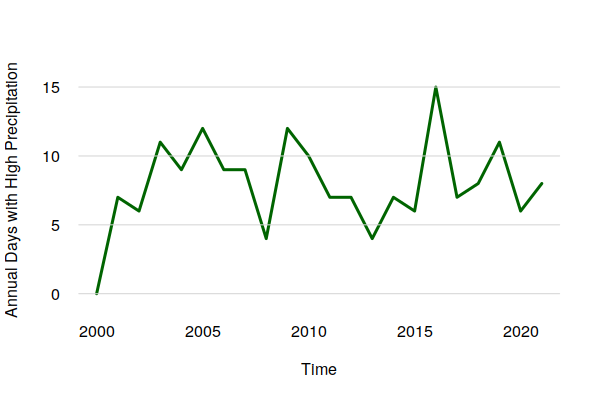 historical$FLOOD = ifelse(historical$PRCP > 1, 1, 0) flooding = period.apply(historical$FLOOD, INDEX = seq(1, nrow(historical) - 1, 365.25), FUN = sum) plot(ts_ts(flooding), col="darkgreen", lwd=3, bty="n", las=1, fg=NA, ylab="Annual Days with High Precipitation") grid(nx=NA, ny=NULL, lty=1) summary(as.numeric(flooding)) Min. 1st Qu. Median Mean 3rd Qu. Max. 0.000 6.250 7.500 7.955 9.750 15.000