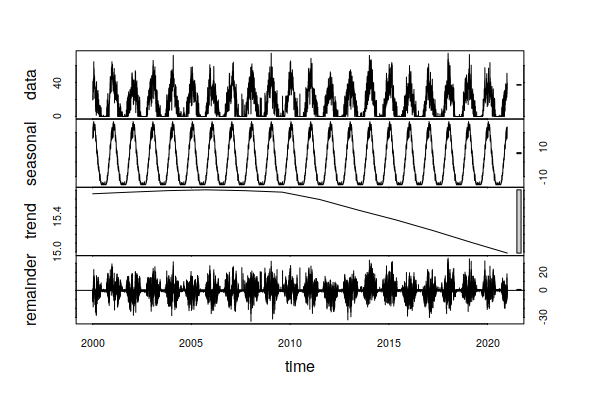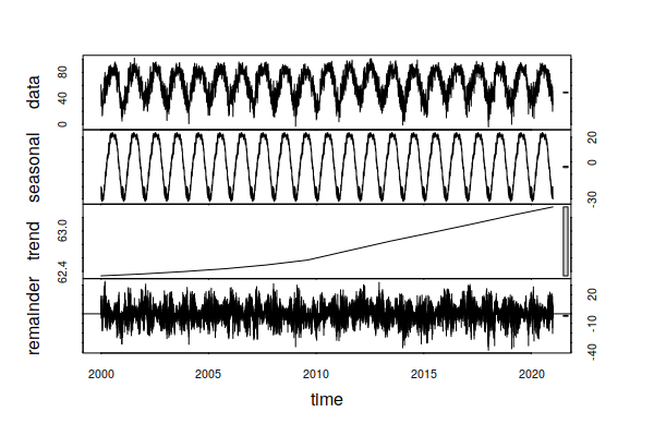 decomposition = stl(ts_ts(historical$TMAX), s.window=365, t.window=7001) plot(decomposition) summary(decomposition$time.series[,"trend"]) Min. 1st Qu. Median Mean 3rd Qu. Max. 62.33 62.43 62.63 62.72 63.00 63.36