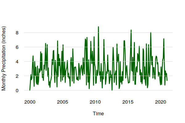 monthly.prcp = period.apply(historical$PRCP, INDEX = seq(1, nrow(historical) - 1, 30.4375), FUN = sum) plot(ts_ts(monthly.prcp), col="darkgreen", lwd=3, bty="n", las=1, fg=NA, ylab="Monthly Precipitation (inches)") grid(nx=NA, ny=NULL, lty=1)