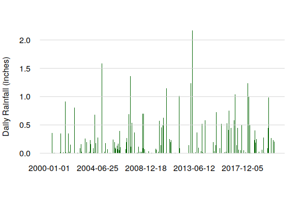 barplot(historical$PRCP, border=NA, col="darkgreen", ylim=c(0, 2), space=0, bty="n", las=1, fg=NA, ylab="Daily Rainfall (inches)") grid(nx=NA, ny=NULL, lty=1)