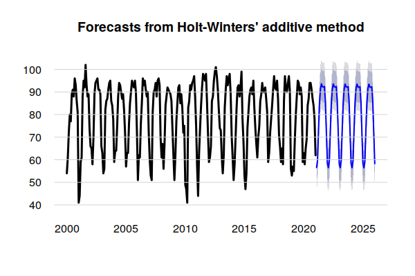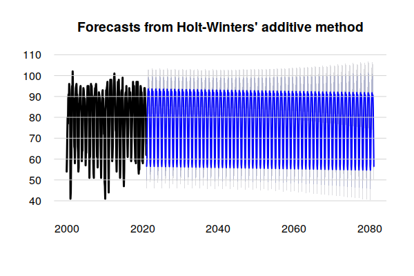 library(forecast) training.data = period.apply(historical$TMAX, seq(1, nrow(historical) - 1, 30.4375), max) model.tmax = hw(ts_ts(training.data), h=60)
