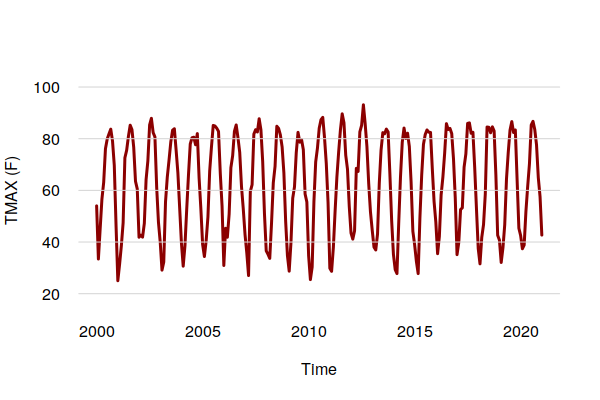 monthly.tmax = period.apply(historical$TMAX, INDEX = seq(1, nrow(historical) - 1, 30.4375), FUN = mean) plot(ts_ts(monthly.tmax), col="darkred", ylim=c(20, 100), lwd=3, bty="n", las=1, fg=NA, ylab="TMAX (F)") grid(nx=NA, ny=NULL, lty=1)