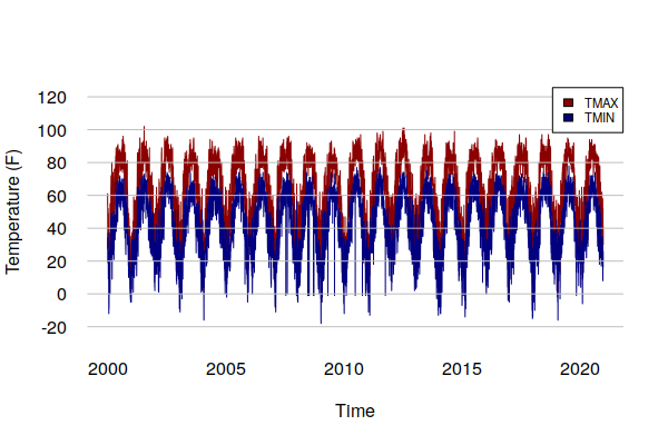 A plot() of TMIN and TMAX show the annual cycle of temperatures as well as extreme temperature events that spike above the general curve.